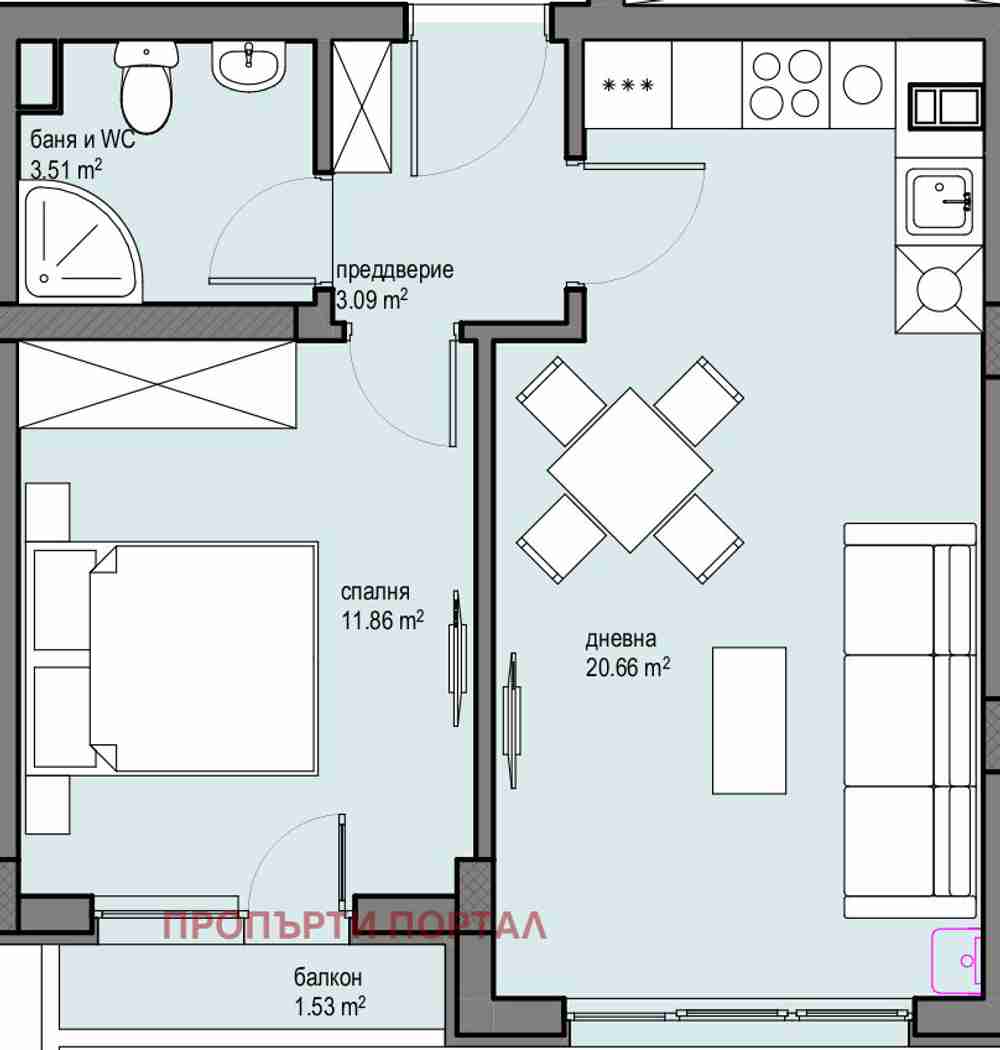 Агенция за недвижими имоти Пропърти Портал представя двустаен апартамент на 4ти жилищен етаж в новострояща се сграда в квартал Красна Поляна.