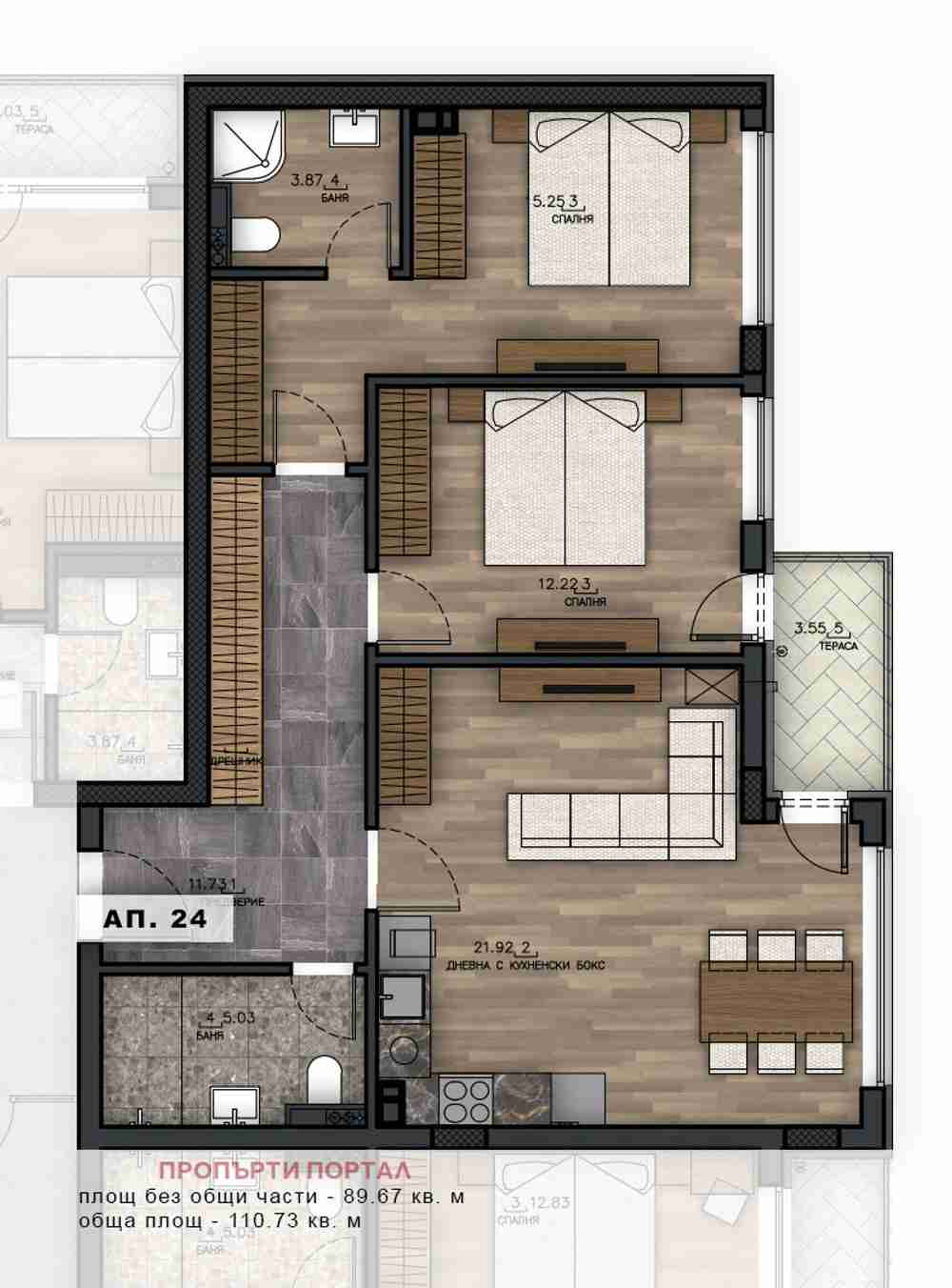 Предлагаме за продажба 3-стаен апартамент в новострояща се жилищна сграда. Жилището е на втори етаж от 6. Чиста жилищна площ 90 кв.м. Състои се от входно антре, голям коридор, дневна с кухненски бокс, 2 спални, 2 бани с тоалетна, 2 тераси.